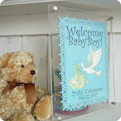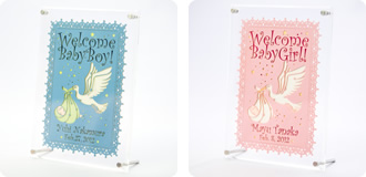 オリジナルな出産祝いとして、誕生日とお名前をデザインフォントでカットいたします。インテリアとして長く飾っていただけるようなサイズ展開となっています。