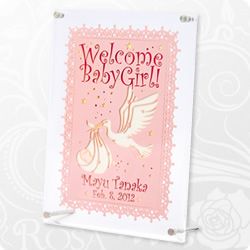 赤ちゃんを運ぶコウノトリをデザインし、誕生日とお名前をデザインフォントでカットしています。
