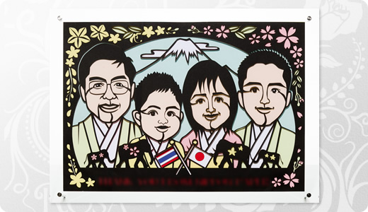 慶事や記念日のギフト、お店のインテリアなどに似顔絵やオリジナルデザインのしあわせきり絵はいかがでしょうか。
